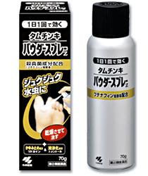 ジュクジュク水虫を乾燥させて治す!!【第(2)類医薬品】【小林製薬】 タムチンキ パウダースプレーZ 70g 噴霧剤 価格: 1,560円 レビュー評価: 0.0 レビュー数:0 タムチンキパウダースプレー Z 項目 内容 医薬品区分 一般用医薬品 薬効分類 みずむし・たむし用薬 承認販売名 製品名 タムチンキパウダースプレー Z 製品名(読み) タムチンキパウダースプレーゼット 製品の特徴 使用上の注意 効能・効果 水虫、いんきんたむし、ぜにたむし 効能関連注意 用法・用量 1日1回、適量を患部に噴霧してください 用法関連注意 成分分量 100g中 成分分量 ブテナフィン塩酸塩200mg リドカイン500mg グリチルレチン酸200mg l-メントール200mg ベンザルコニウム塩化物10mg 添加物 ミリスチン酸イソプロピル、エタノール、タルク、酸化チタン、ト Supported by 楽天ウェブサービス |
